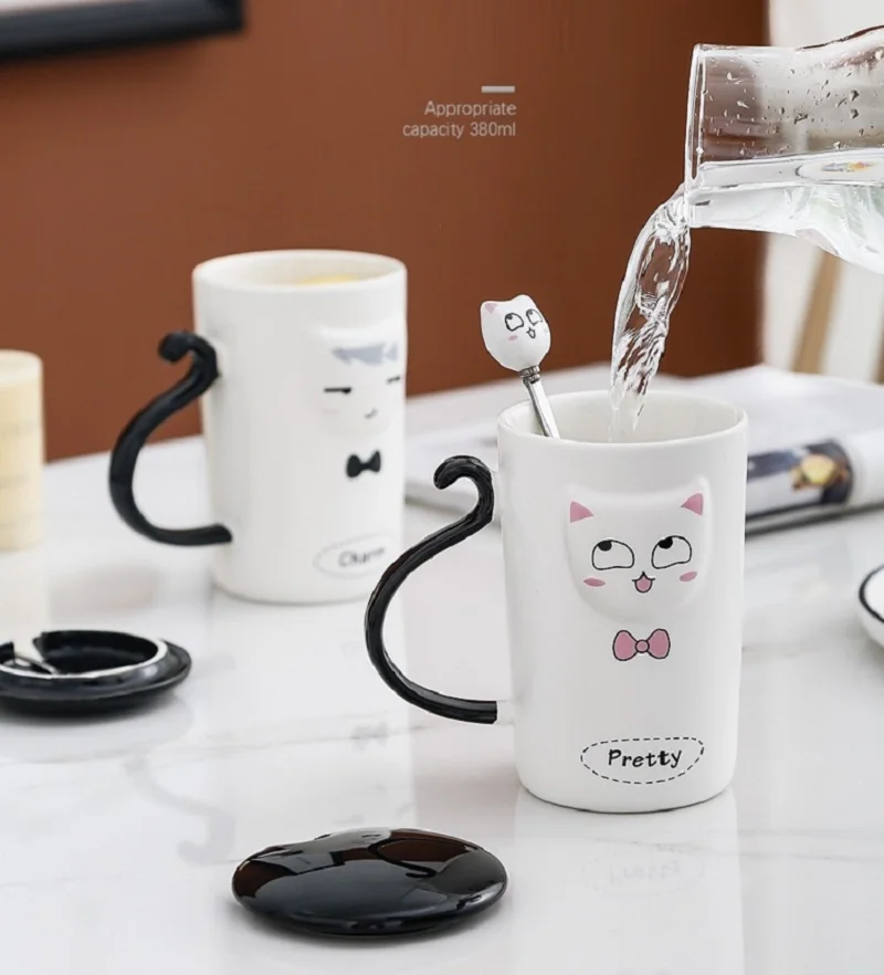 BEST Cute Embossed Cat Couple Ceramic Mug Black and White Cat Kiss Mug Wedding Housewarming Gift With Sp